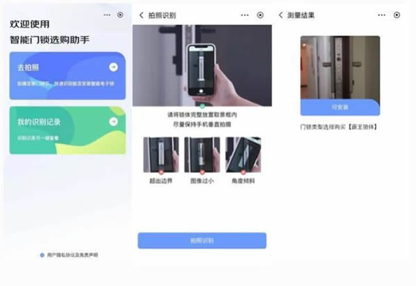京東智能門鎖節上線的“智能門鎖選購助手”工具完美解決這一困擾。消費者打開選購助手,只需對準門鎖位置一鍵拍照,一秒即可識別自家門鎖是標準鎖體、霸王鎖體還是其他鎖體,無需反復測量,簡單高效且精準無憂;以識別結果為依據,商家客服即可快速推薦適配的產品。活動期間,消費者可通過京東APP搜索“智能鎖選購助手”,或者咨詢商家客服、產品商詳頁面,體驗這款超級給力的小工具。“智能門鎖選購助手”的上線,不僅提升了消費者的購買效率,也一定程度避免了消費者因反復溝通與產品“擦肩而過”,幫助商家提升了銷售轉化率。