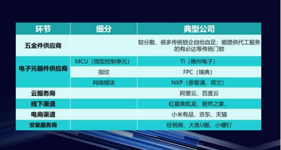 4>安防廠商:安防巨頭主要從工程渠道切入,直接與房地產(chǎn)開發(fā)商接洽,在安裝攝像頭、對講等安防系統(tǒng)時,直接預(yù)裝門鎖。