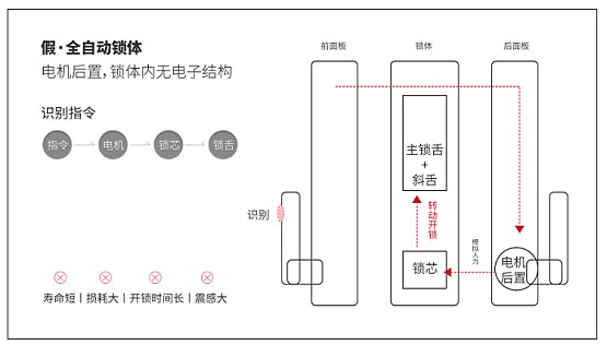 目前市面上充斥著很多質量堪憂的全自動智能鎖,甚至他們使用的鎖體不是真正的全自動鎖體。雖然開門體驗上也是一觸即開,但實際上這種指紋鎖采用電機后置的方式,造價成本低。鎖體內沒有電子結構,指令發出后,通過后面板的電機驅動鎖芯轉動從而操控鎖舌,而這種“扭動裝置”對鎖的損耗十分大,不僅開鎖時間長、震感強烈等弊端,更重要的是鎖的壽命非常短。
